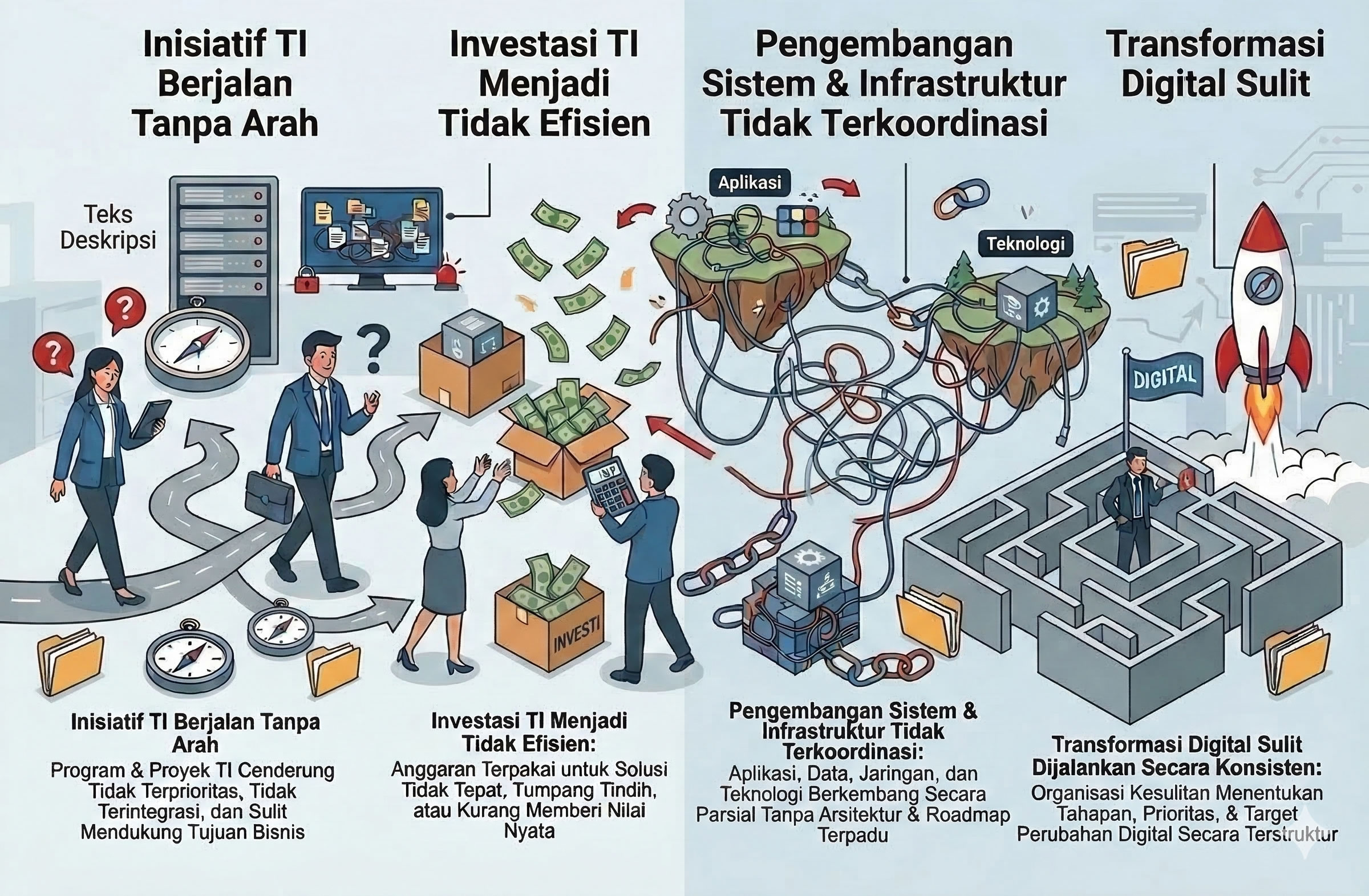 IT Master Plan adalah dokumen rencana strategis yang menjadi pedoman organisasi dalam mengarahkan pengembangan teknologi informasi secara terstruktur, bertahap, dan selaras dengan tujuan bisnis. Dokumen ini biasanya memuat kondisi TI saat ini, kebutuhan bisnis, target yang ingin dicapai, prioritas inisiatif, roadmap implementasi, serta arah pengembangan aplikasi, data, infrastruktur, keamanan, dan tata kelola TI. Dengan adanya IT Master Plan, organisasi memiliki acuan yang jelas untuk menentukan investasi, program kerja, dan langkah transformasi digital agar lebih efektif, terintegrasi, dan berkelanjutan.